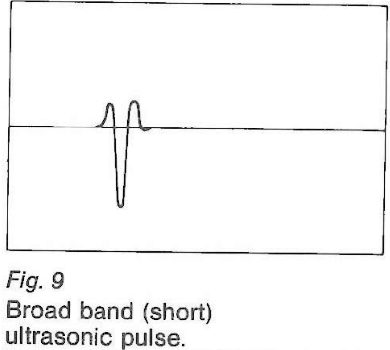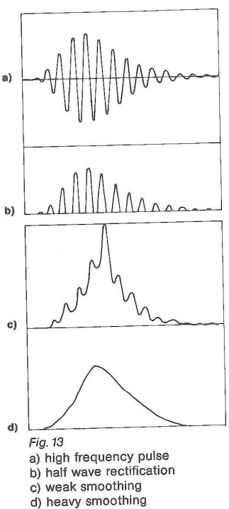 每個(gè)探頭在檢測(cè)樣品內(nèi)部生成圖8或圖9中所示的聲音脈沖,但這些脈沖在屏幕上的顯示形式可能與實(shí)際樣品中的聲音脈沖有所不同,這是因?yàn)榻邮战M件的整流和平滑處理會(huì)影響到最終顯示的脈沖形式(如圖13所示)。這種屏幕修飾可能導(dǎo)致如圖8,9,包含在原始脈沖中的最佳樣品條件的相關(guān)信息有部分丟失了。