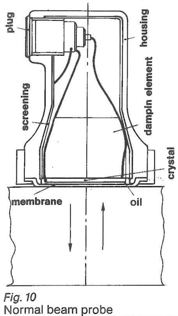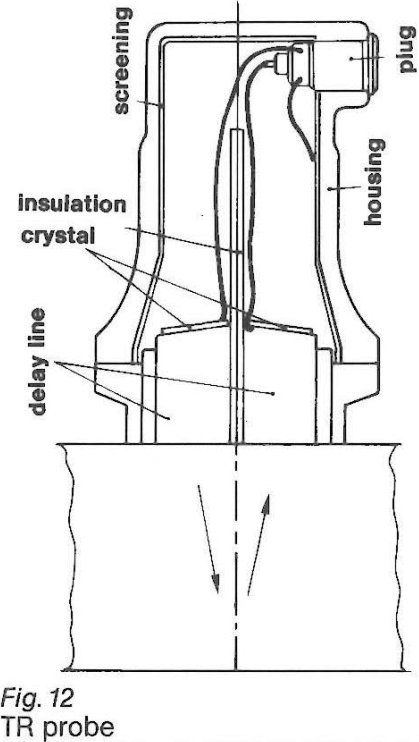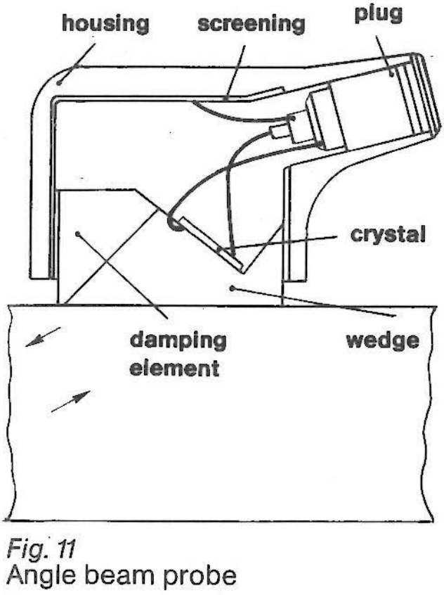 直探頭是指聲波垂直于樣品表面輻射的探頭,而斜探頭則是聲波以一定角度輻射的探頭(如圖10、11所示)。有些探頭同時(shí)具備發(fā)射和接收功能,被稱為收發(fā)(TR)兩用探頭(如圖12所示)。