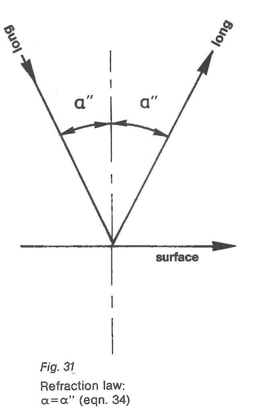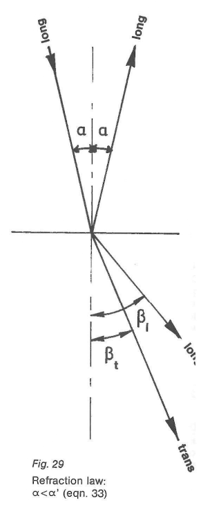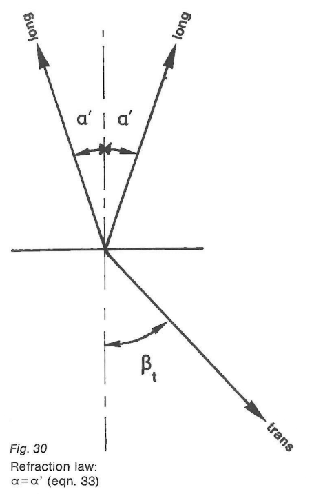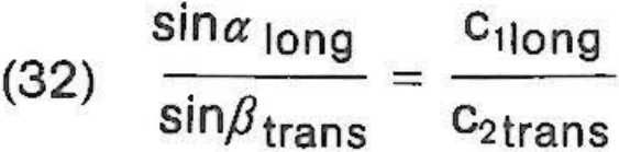 當(dāng)折射角a超過臨界角a時,在介質(zhì)2中將不再產(chǎn)生縱波,只會形成橫波。當(dāng)sin f trans等于1時,這意味著存在第二個極限角a”(如圖31所示),這可以通過方程式(34)來描述: