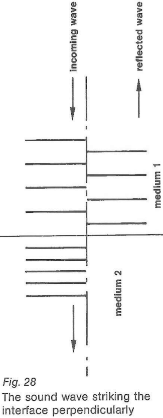 聲波在傳播時會受到兩種具有不同彈性特性介質(zhì)交界面的限制。當(dāng)攜帶平面波波前的聲波撞擊到兩種無限介質(zhì)的分界面時,部分聲波會以平面波的形式被反射回來,而另一部分會穿透這個界面(如圖28所示)。反射波的聲壓pr與入射波的聲壓pe之間的比例被定義為反射系數(shù)R: