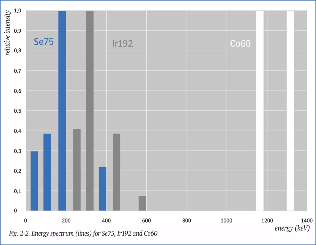 圖中顯示了硒75(Se75)、鈷60(Co60)和銥192(Ir192)的能譜線。在實(shí)際無損檢測(cè)應(yīng)用中,源(放射性同位素)被分配了用于計(jì)算的平均名義能量值,詳見關(guān)于放射源的后續(xù)部分。具有最高能級(jí)(keV電子伏特值)的頻譜分量對(duì)射線照相質(zhì)量的影響最大。