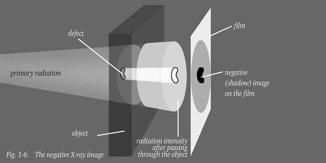 X射線或伽瑪射線的強度在穿過物體時會因輻射的吸收和散射而局部減弱。對于均勻的物體,主射線的衰減也是均勻的,膠片會均勻曝光。如果物體內(nèi)部存在缺陷或厚度變化,膠片的表面會受到不均勻的曝光,導致物體及其缺陷的陰影圖像。當膠片經(jīng)過處理后,輻射強度的變化會呈現(xiàn)為不同的膠片密度;較高的輻射強度產(chǎn)生較高的膠片密度,如圖1-6所示。