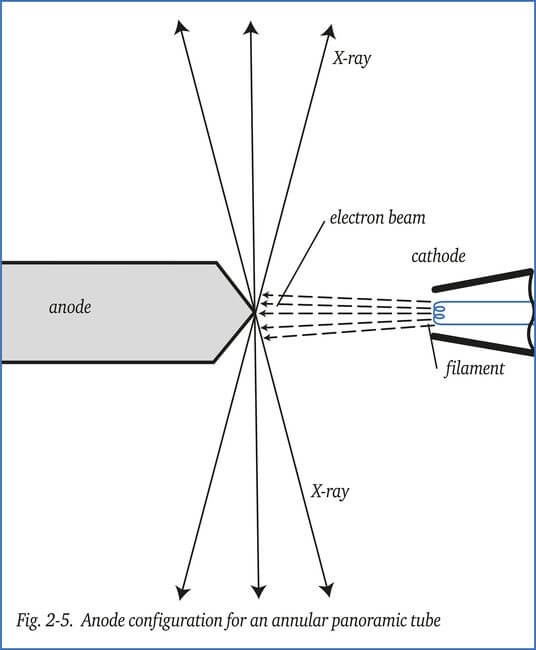如圖1c-5所示,帶有長空心陽極的單極X射線管通常被稱為“桿陽極管”,可以插入管或容器中。這些管產(chǎn)生360o的環(huán)形(全景)束,因此可以在一次曝光中對整個周長的焊縫進行放射線攝影。圖2-5顯示了一個(360o)全景管的圓錐形陽極,可以從中心均勻地對周長焊縫進行放射線攝影。使用此陽極時,電子束的軸線必須以使生成的X射線束垂直于管的縱軸的方式擊中錐頂。注意:定制形狀的陽極使生成的X射線束不垂直(傾斜)于管的中心線的情況(在過去是可以接受的),在需要按官方標準執(zhí)行工作時不再被允許。
