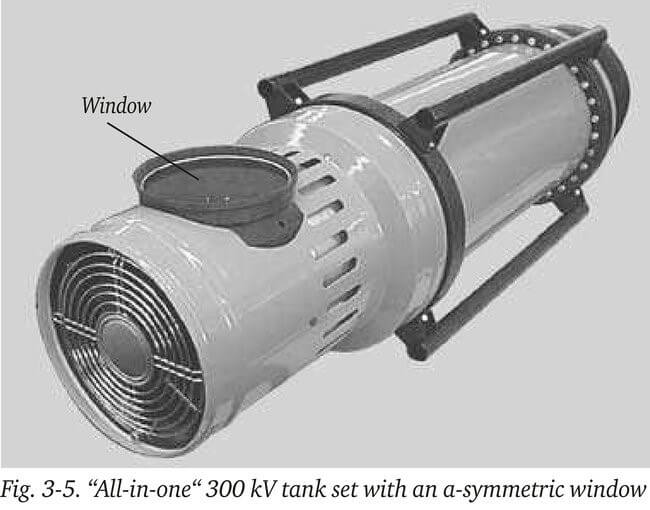 圖3-5顯示了一個整合(一體化)的300kV罐式設(shè)備。當電壓超過300kV時,所有部件都集成在一個罐中就面臨挑戰(zhàn),因為高電壓絕緣可能會變得不足。直流運行的450kV設(shè)備通過高壓導線、連接器和插頭連接到單獨的高壓(HT)供電單元,參見圖4-5。,這些設(shè)備的體積和重量都大于集成式的罐式設(shè)備,更適用于固定或半移動的應(yīng)用場景。