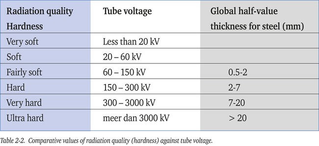 輻射質(zhì)量硬度 Very soft:非常柔軟 Soft:軟 Fairly soft:較柔軟 Hard: 硬 Very hard: 非常硬 Ultra hard: 超級硬 Tube Voltage:管電壓 Less than: 低于 Meer dan: 高于 Global half-value thickness for steel: 總體鋼材的半值厚度