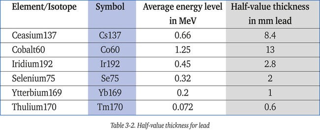 Isotope:同位素 Symbol:化學(xué)符號 Average energy level in Mev:平均能量水平(以 Mev 為單位) Half-value thickness in mm lead: 以毫米引線為單位的半值厚度